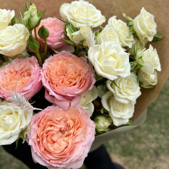 Роза кустовая пионовидная джульетта – 1 шт.роза кустовая сноулейк – 3 шт.Колосья пшеницы – 1 шт.