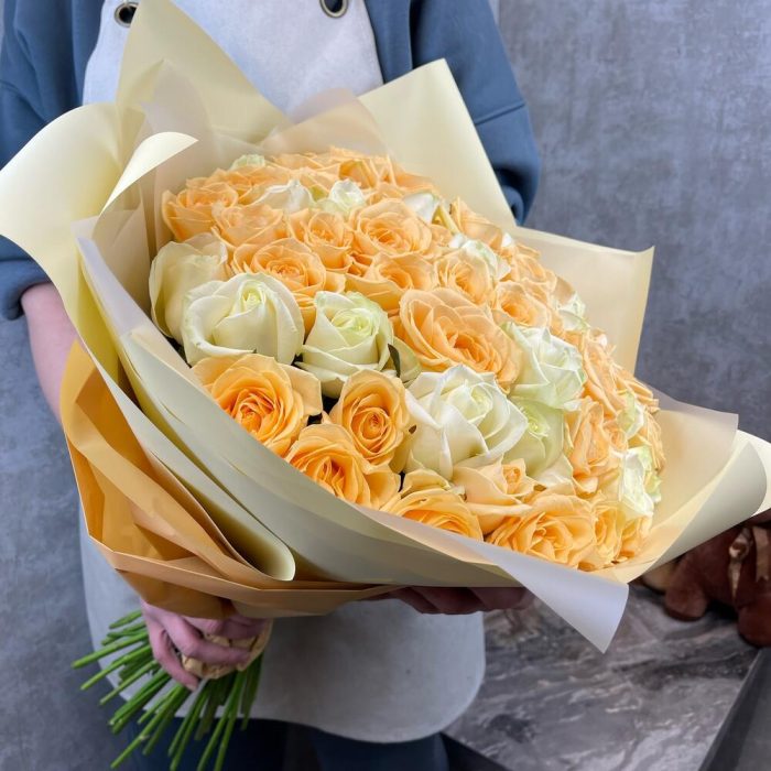 белые розы – 29 шт.Персиковая Роза – 30 шт.