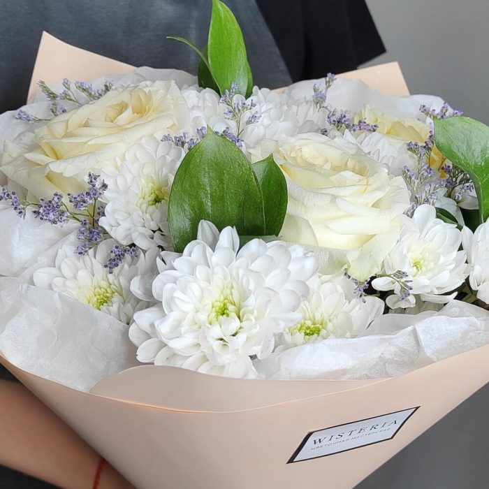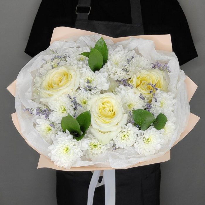 Букет ароматных роз, хризантемы и лилового лимониума “Нежность”