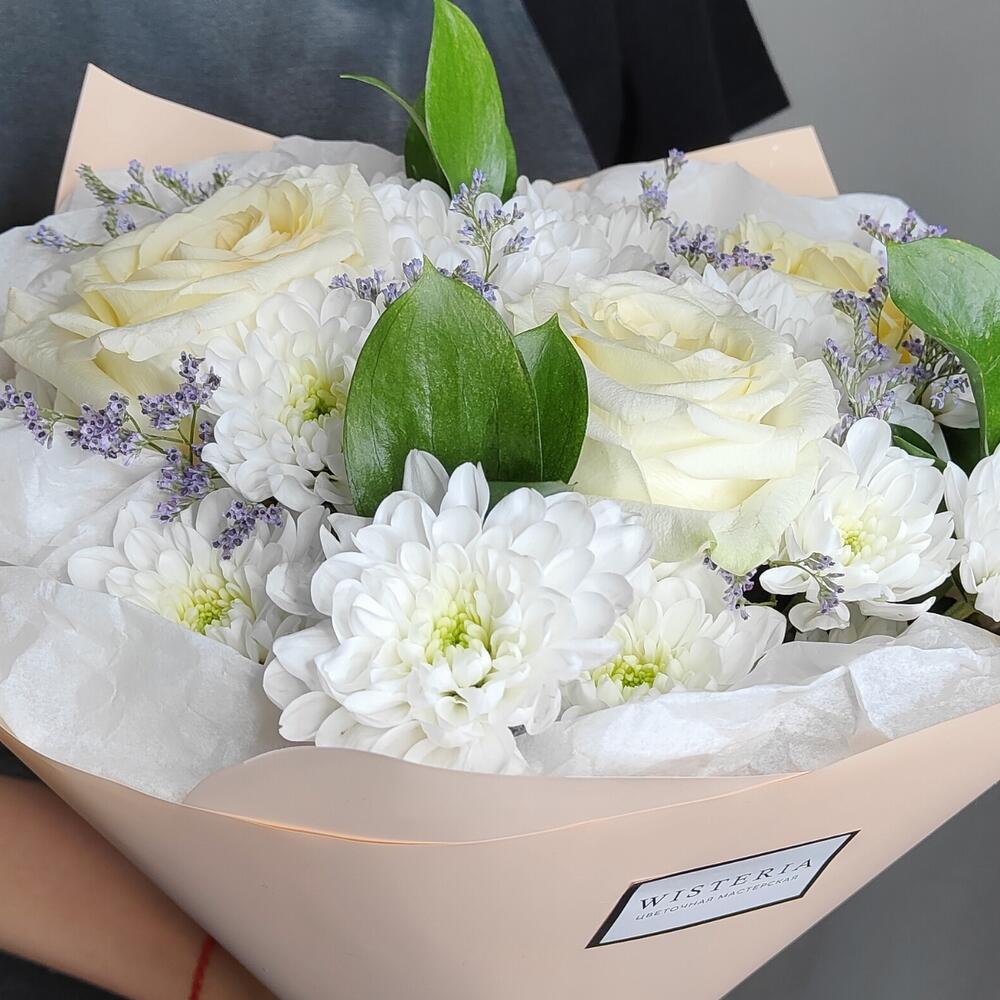 Букет ароматных роз, хризантемы и лилового лимониума "Нежность"