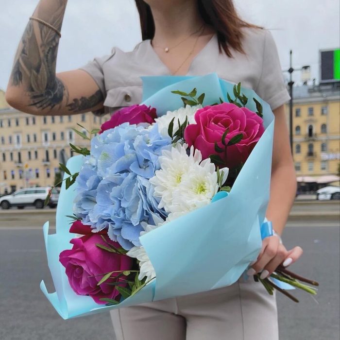 Гортензия – 1 шт.Роза – 3 шт.Хризантема кустовая – 3 шт.Фисташка пучок – 1 шт.бумага дизайнерская – 1 шт.Лента – 1 шт.