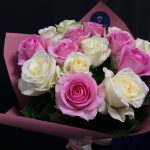 Розовая роза – 7 шт.белая роза – 8 шт.Упаковка цветная – 2 шт.Лента атласная – 4 шт.
