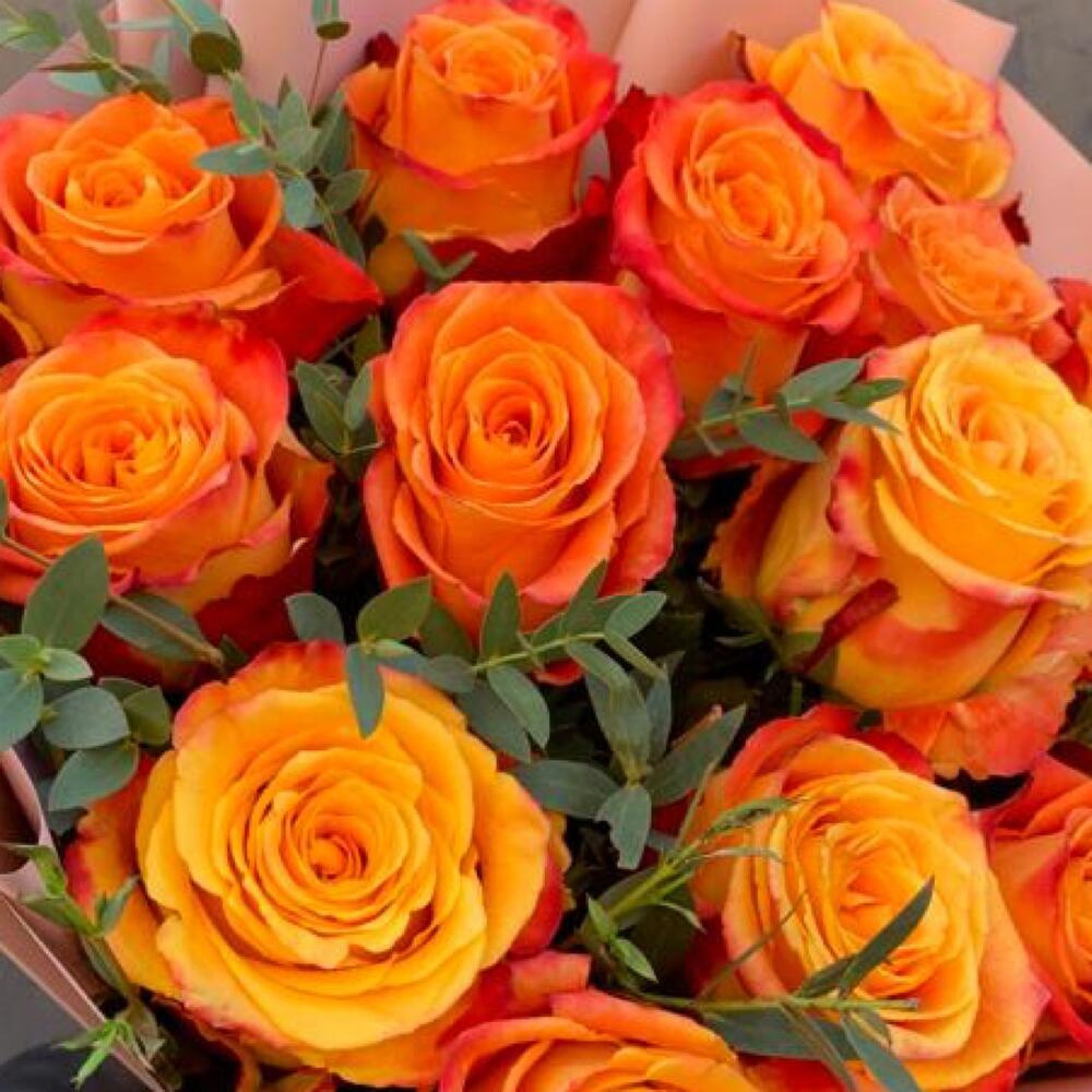 Букет из 15 красно-жёлтых роз с эвкалиптом