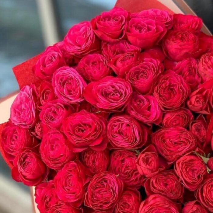 розыпионовидные красные – 51 шт.Упаковка дизайнерская – 1 шт.Лента атласная – 1 шт.Открыточка с вашими пожеланиями – 1 шт.хорошее настроение – 100 шт.инструкция по уходу за цветами – 1 шт.коробка переноска – 1 шт.Кризал – 1 шт.