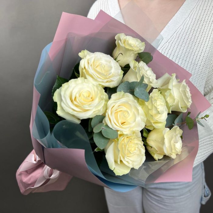 Букет из 9 белых роз с эвкалиптом