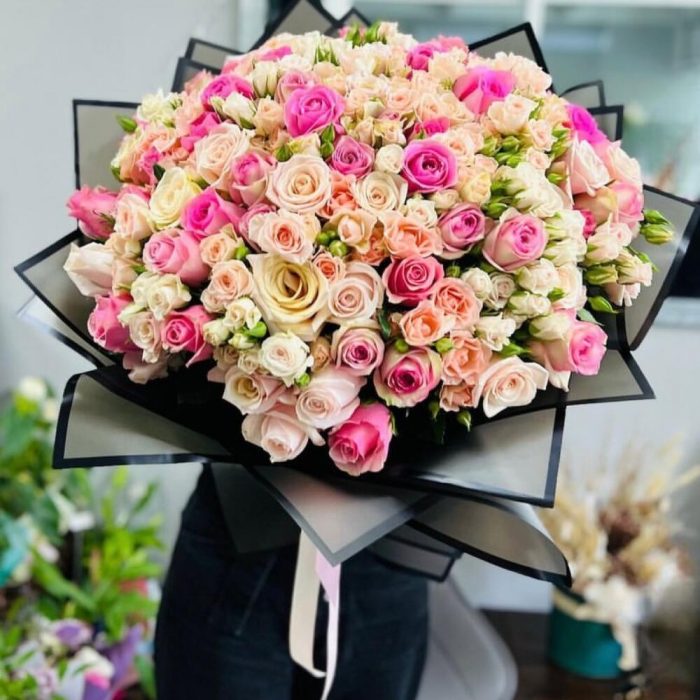ассорти роз – 51 шт.Упаковка дизайнерская – 1 шт.Лента атласная – 2 шт.Открытка – 1 шт.инструкция по уходу за цветами – 1 шт.хорошее настроение – 100 шт.коробка переноска – 1 шт.Кризал – 1 шт.роза кустовая ассорти – 50 шт.