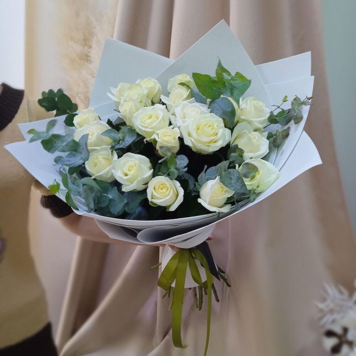 Роза – 21 шт.Эвкалипт – 6 шт.Дизайнерская упаковка – 1 шт.Лента атласная – 1 шт.подкормка для срезанных цветов – 1 шт.