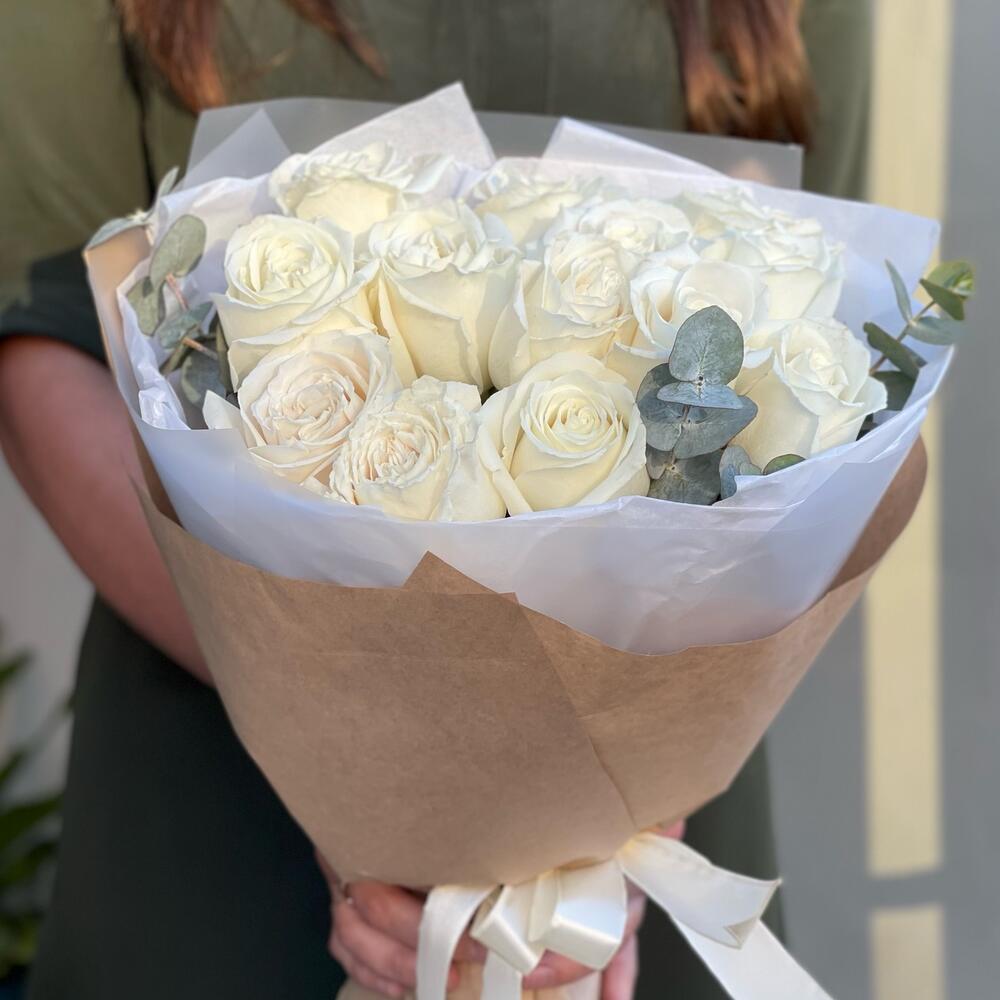 Эвкалипт – 1 шт.Роза одноголовая – 13 шт.Лента атласная – 1 шт.Тишью – 1 шт.Упаковка дизайнерская – 1 шт.