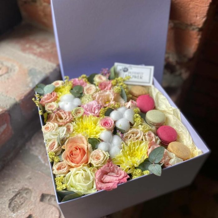 Букет из цветов и макаронс в декоративной коробке “Сладкое солнце”