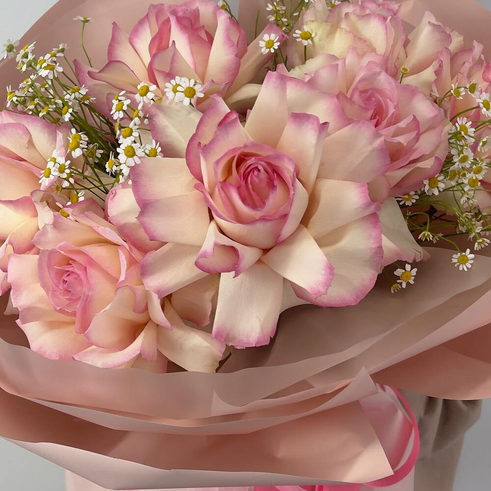 Букет из французских роз ,ромашек в дизайнерском оформлении