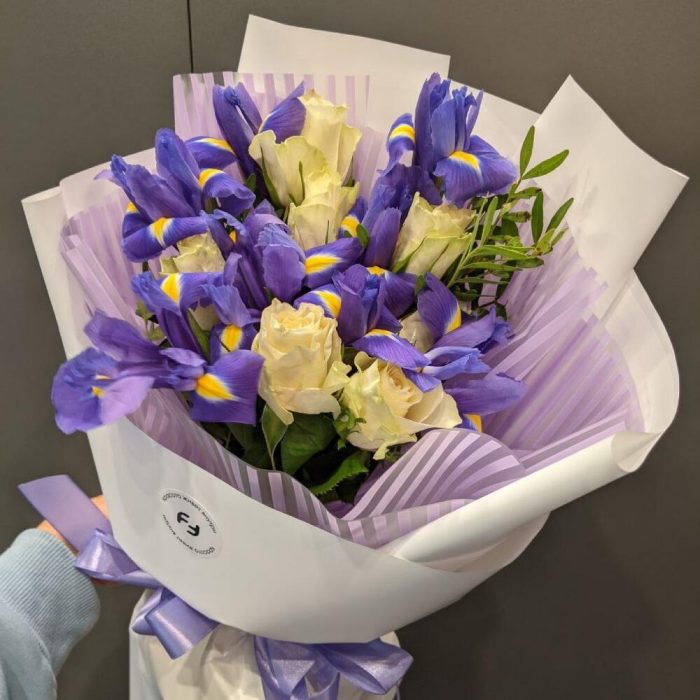 роза белая кения 40 см – 7 шт.Ирис синий – 8 шт.Упаковка дизайнерская – 2 шт.Лента атласная – 2 шт.