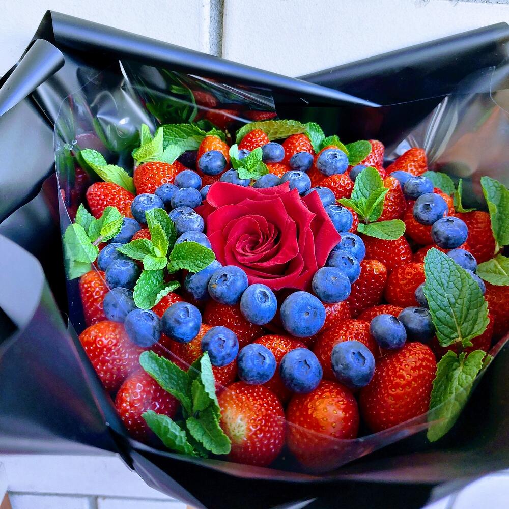 Клубника – 45 шт.Голубика – 125 гр.Мята пучок – 1 шт.Роза – 1 шт.Упаковка дизайнерская – 1 шт.