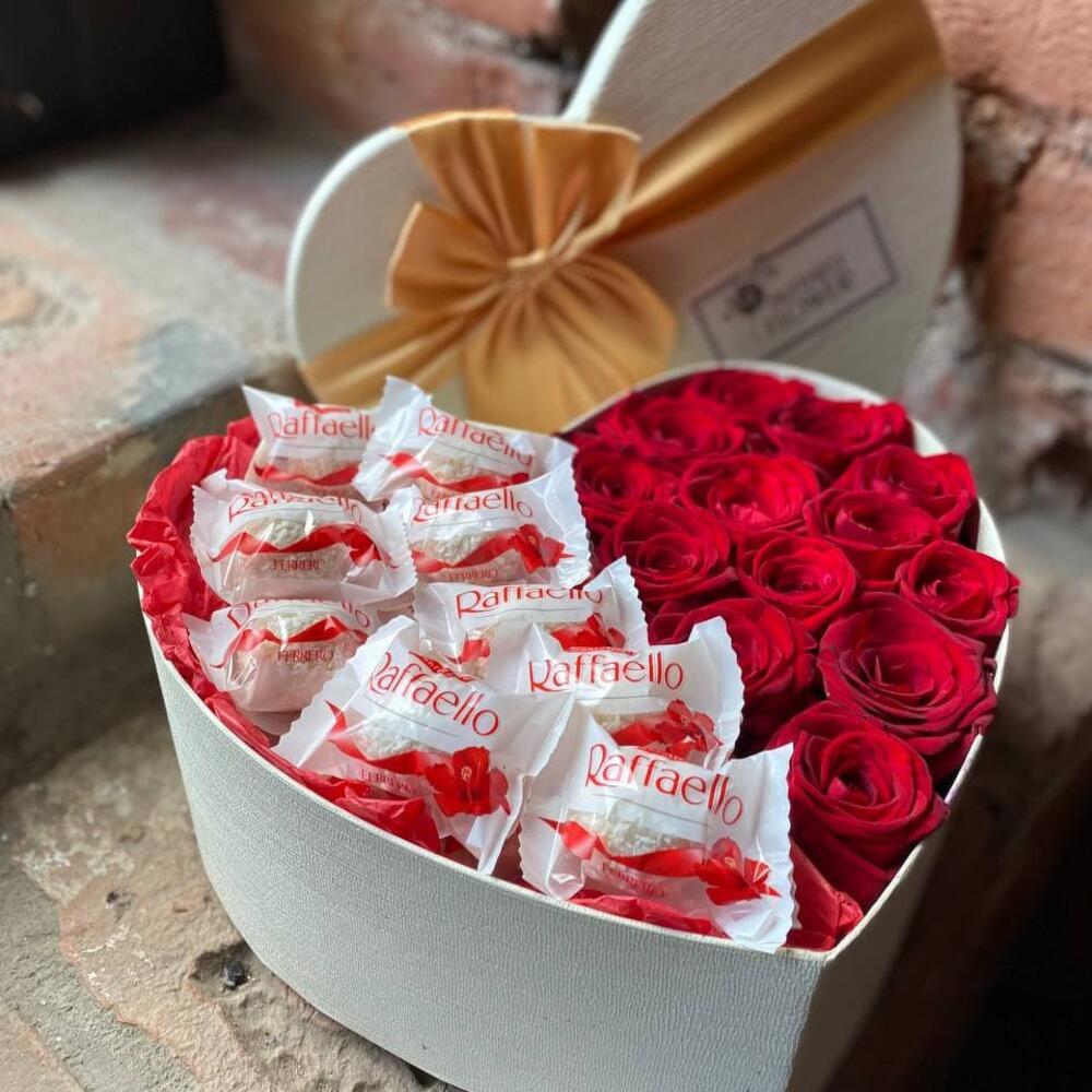 Букет из красных роз и рафаэлло в декоративной коробке-сердце “Джаггер”