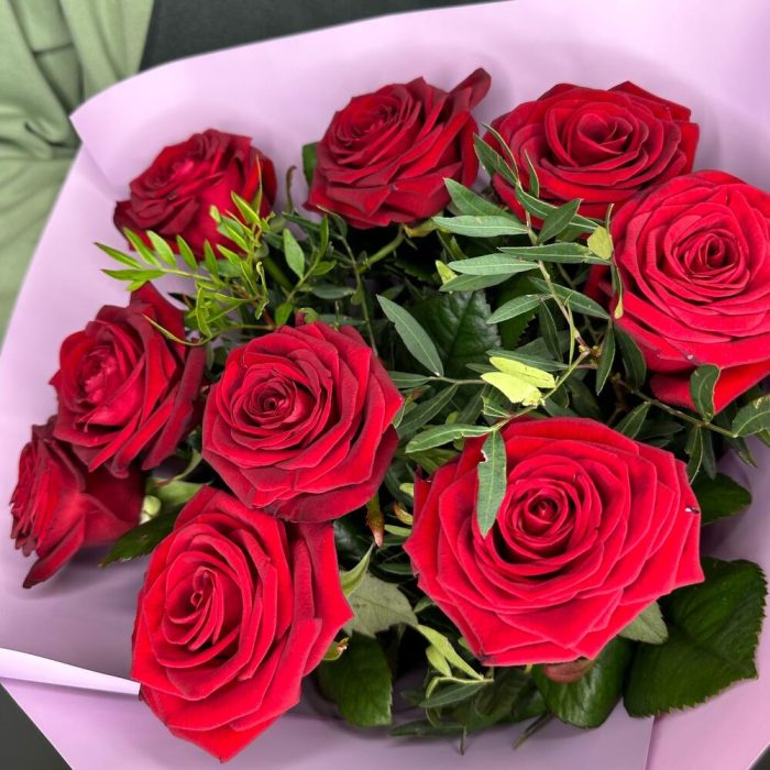 Букет из красных роз с зеленью