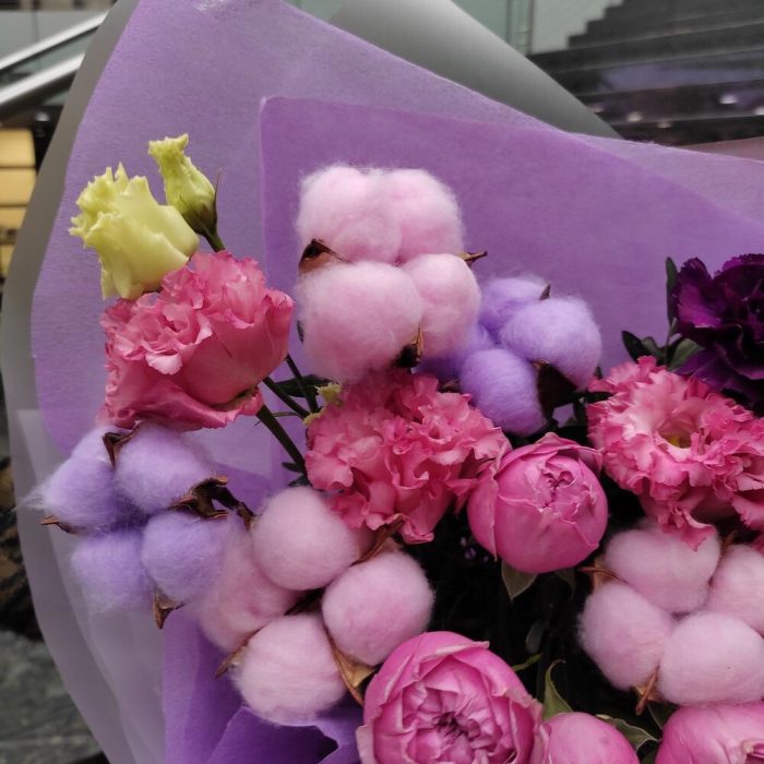 Лизиантус – 1 шт.Хлопок – 6 шт.Диантус – 2 шт.Роза кустовая пионовидная – 1 шт.Пальма – 1 шт.Лента – 2 шт.Упаковка дизайнерская – 2 шт.