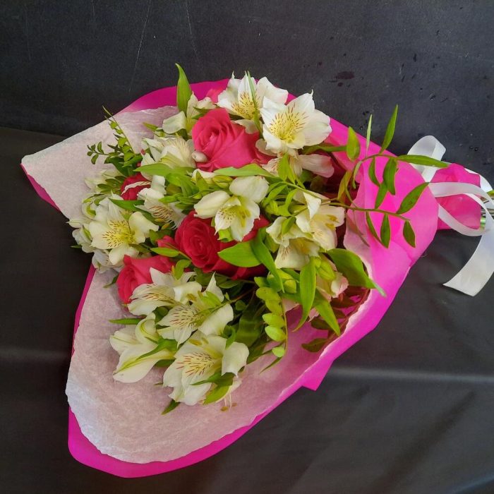 Букет из малиновых роз и белой альстромерии