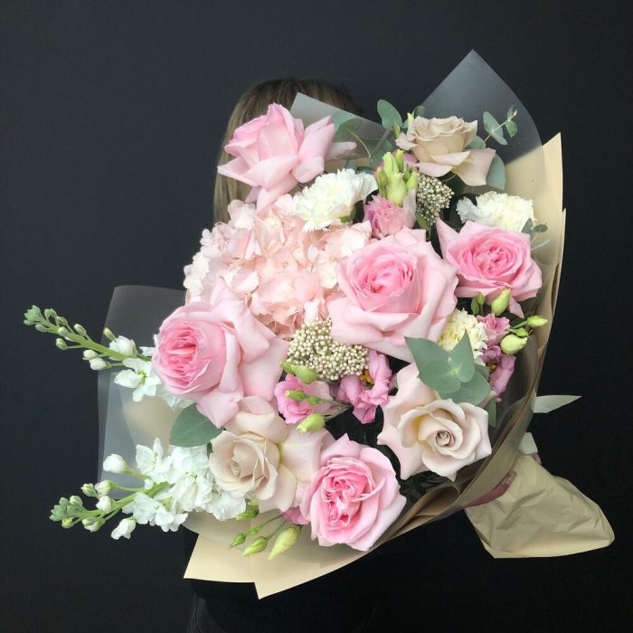 Гортензия – 1 шт.Лизиантус – 2 шт.Маттиола – 2 шт.Озотамнус – 2 шт.Эвкалипт – 2 шт.Роза – 3 шт.Диантус – 3 шт.Эквадор роза – 5 шт.