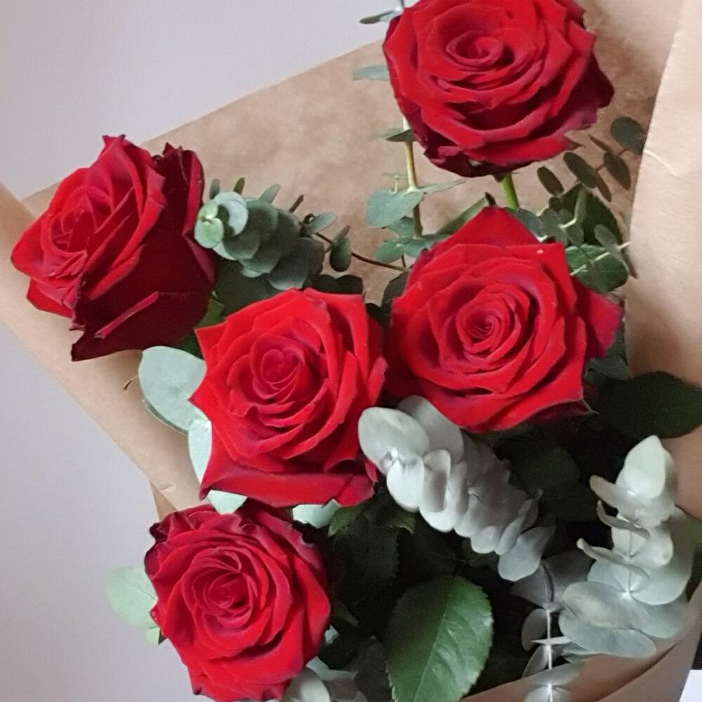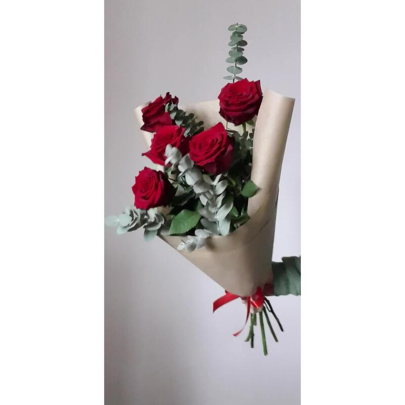 Эвкалипт – 5 шт.Упаковка – 2 шт.Лента атласная – 1 шт.Роза Эксплорер – 5 шт.