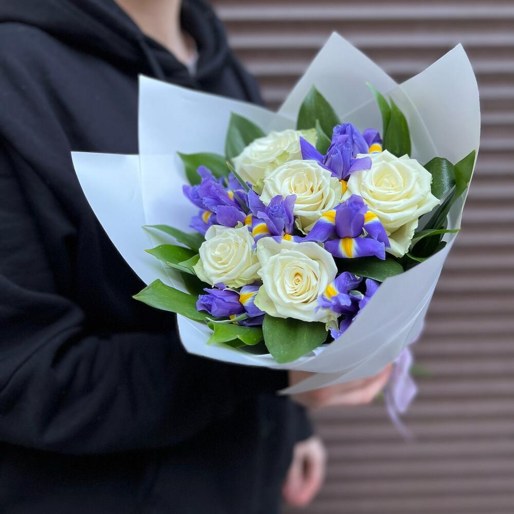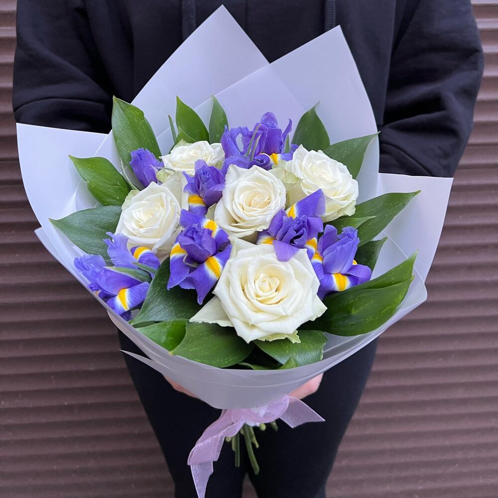 Ирис – 8 шт.Зелень – 8 шт.Роза белая – 5 шт.корея пленка – 1 шт.