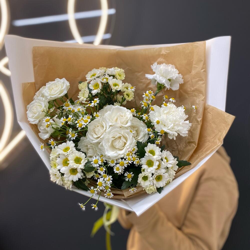Букет кустовых роз и ромашки