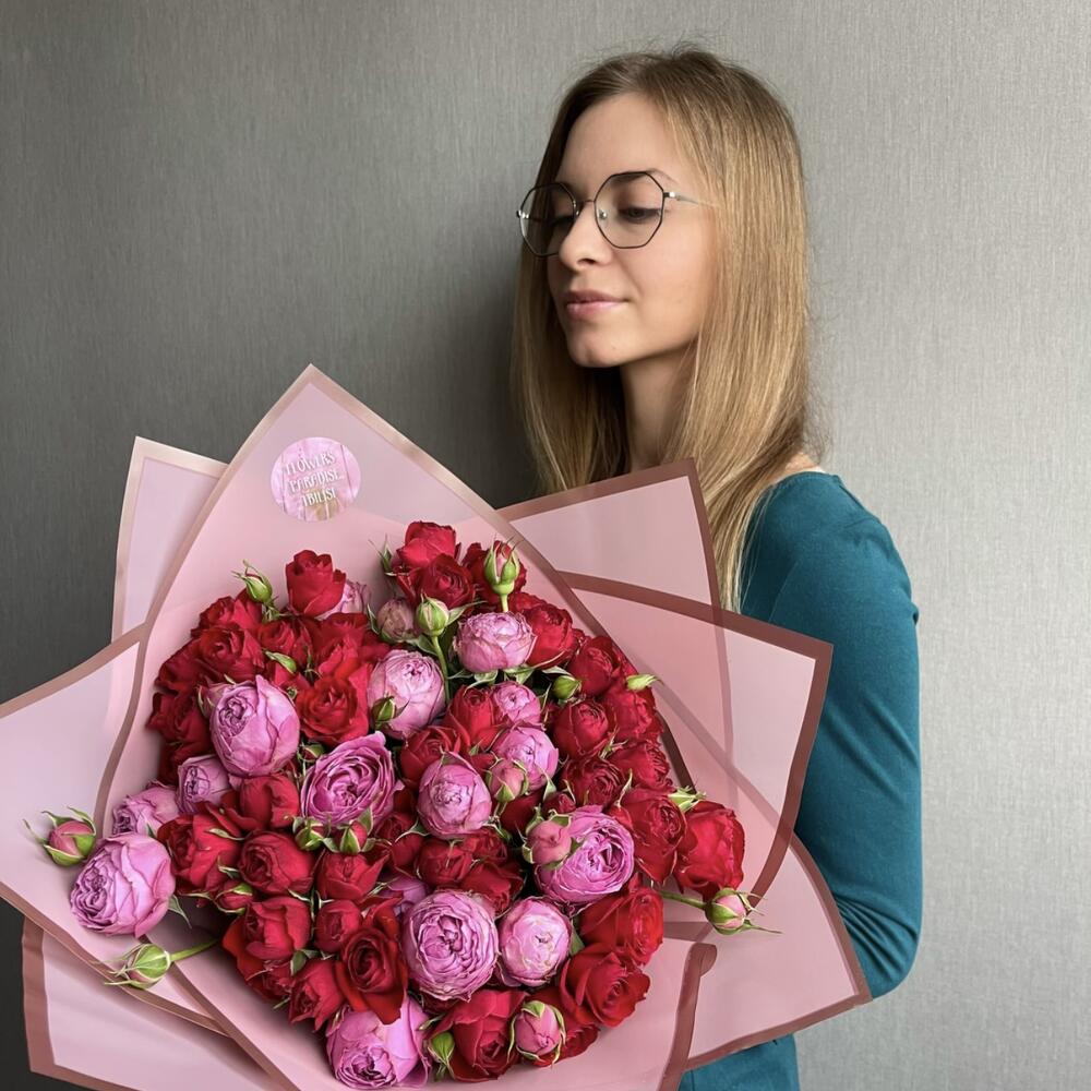 Кустовая роза – 10 шт. Упаковка – 1 шт. Атласная лента – 1 шт.