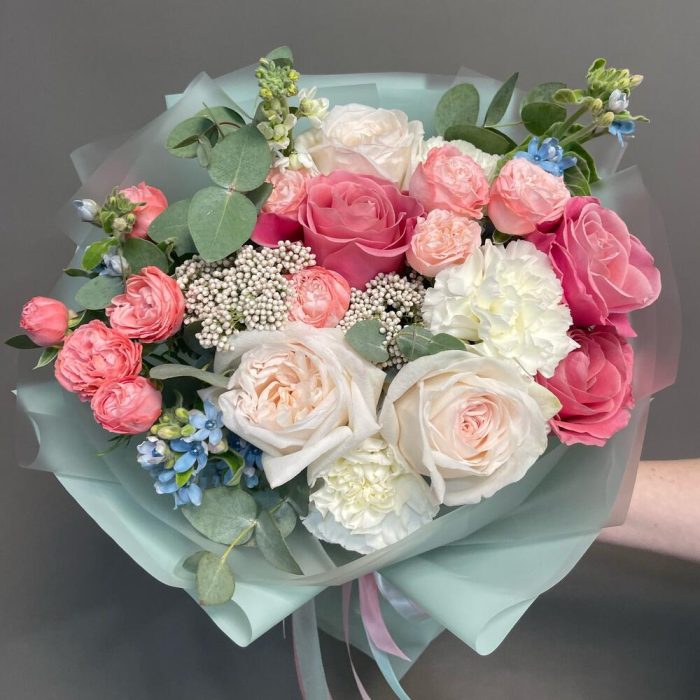 Роза Охара – 3 шт.Роза пионовидная розовая – 3 шт.Гвоздика – 3 шт.Бомбастик роза – 3 шт.Маттиола – 1 шт.Озотамнус – 2 шт.Оксипеталум – 3 шт.Эвкалипт – 3 шт.Упаковка дизайнерская – 2 шт.Лента атласная – 2 шт.