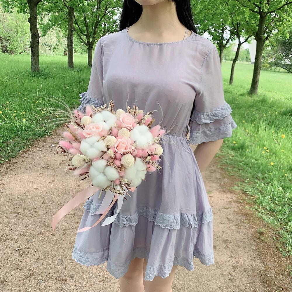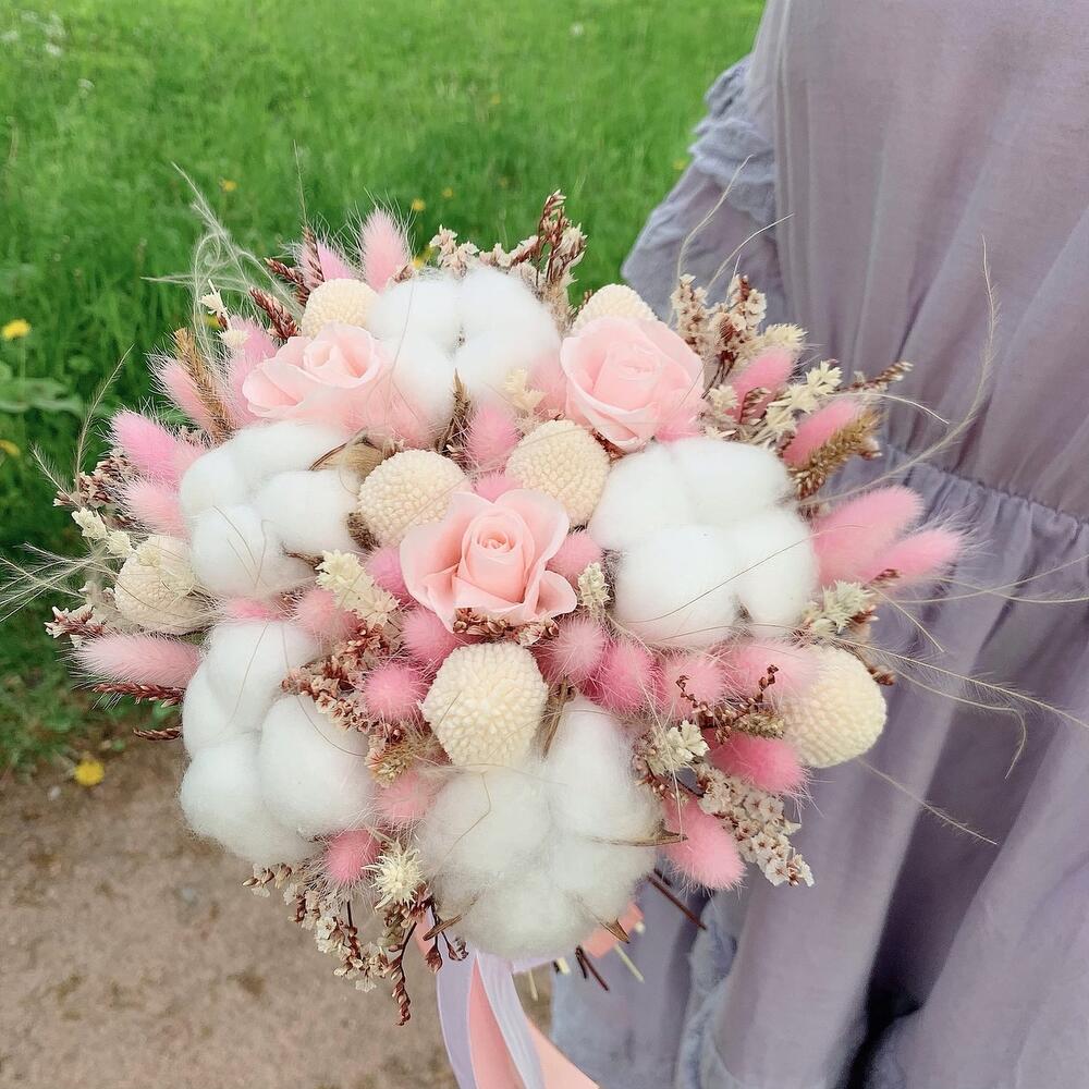 Хлопок – 5 шт.Роза стабилизированная – 3 шт.Краспедия – 7 шт.шандра – 7 шт.кармен – 7 шт.лимониум стабилизированный – 1 шт.Лагурус (сухоцвет) – 1 шт.Ковыль – 1 шт.