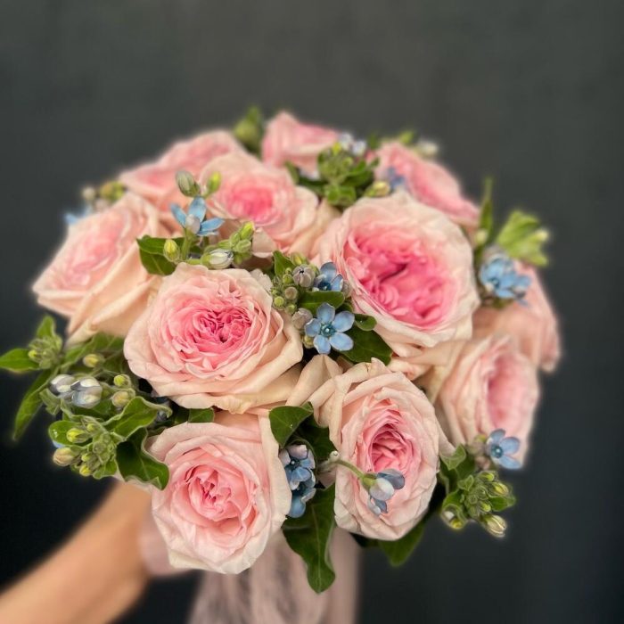 Пионовидная роза – 11 шт.Атласная лента – 1 шт.Оксипеталум – 9 шт.