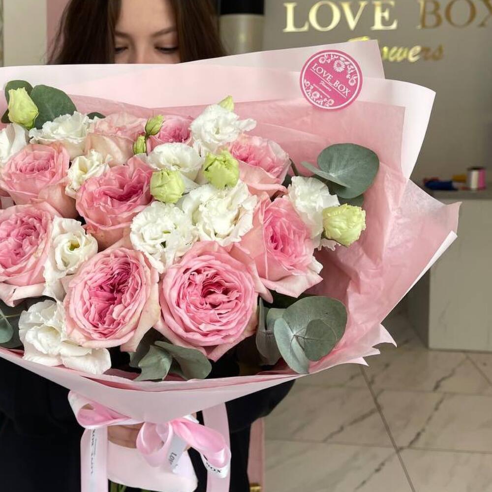 Роза пионовидная – 9 шт.Эустома – 5 шт.Эвкалипт – 5 шт.Авторская упаковка – 4 шт.