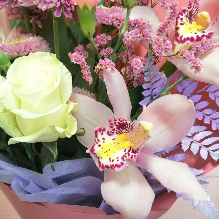 Лента – 1 шт.Лимониум – 2 шт.Папоротник – 1 шт.Хризантема кустовая – 1 шт.Роза Эквадор – 3 шт.Гвоздика – 2 шт.Упаковка дизайнерская – 1 шт.Рускус сочи – 4 шт.Орхидея цветок – 3 шт.