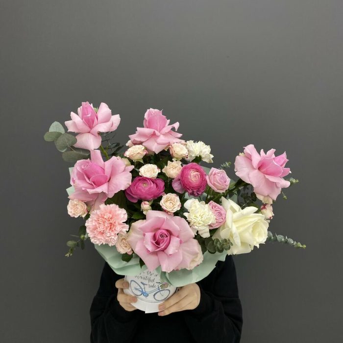 “Атлас☁️” – цветочная композиция с зефиром в деревянном ящике
