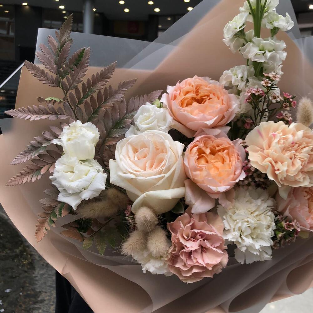 Роза пионовидная – 1 шт.роза вайт о хара( ароматная) – 1 шт.Эустома – 2 шт.Гвоздика – 2 шт.Папоротник – 1 шт.Лагурус – 3 шт.Маттиола – 1 шт.Упаковка дизайнерская – 3 шт.