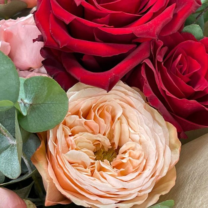 Лента – 2 шт.Эвкалипт – 2 шт.Упаковка – 2 шт.Роза Эксплорер – 5 шт.Роза Джульетта – 2 шт.Роза кахала – 3 шт.