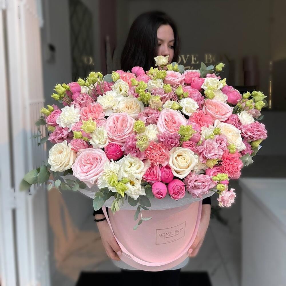 Роза пионовидная – 12 шт.Эустома – 14 шт.Кустовая роза – 5 шт.Диантус – 10 шт.Роза Эквадор – 10 шт.Эвкалипт – 5 шт.Шляпная коробка – 1 шт.