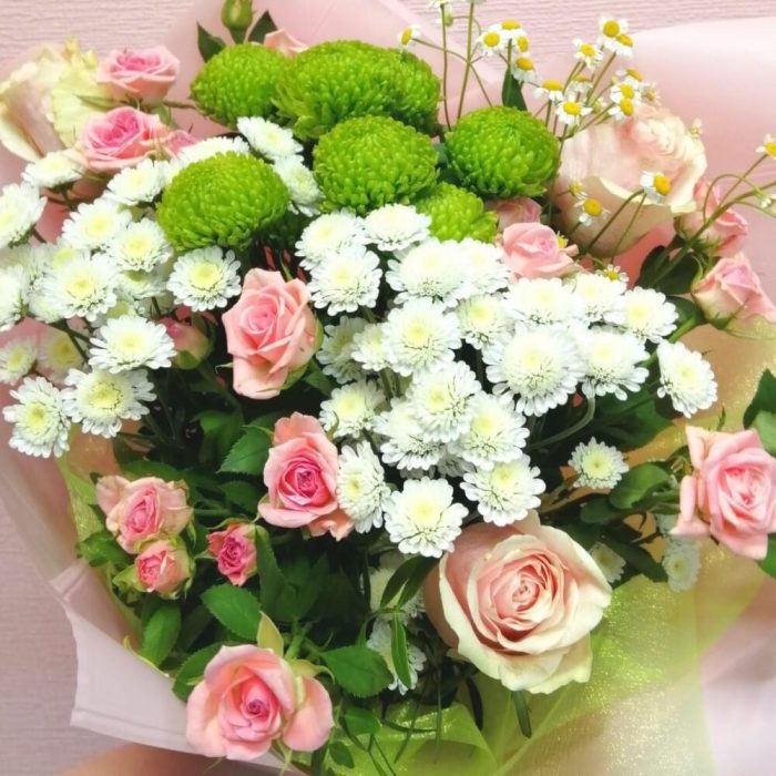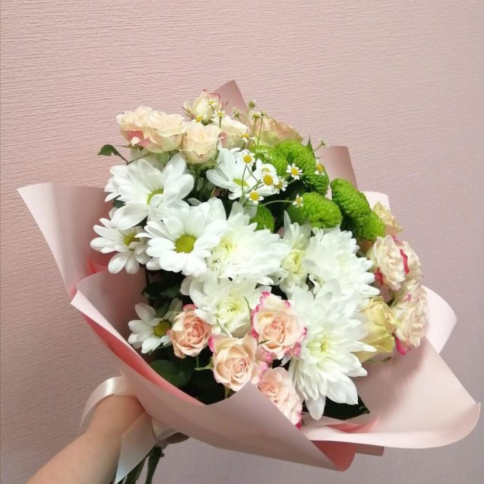 Лента – 1 шт.Роза кустовая – 3 шт.Хризантема кустовая – 3 шт.Роза – 3 шт.Упаковка – 1 шт.Матрикария – 1 шт.Фисташка – 1 шт.