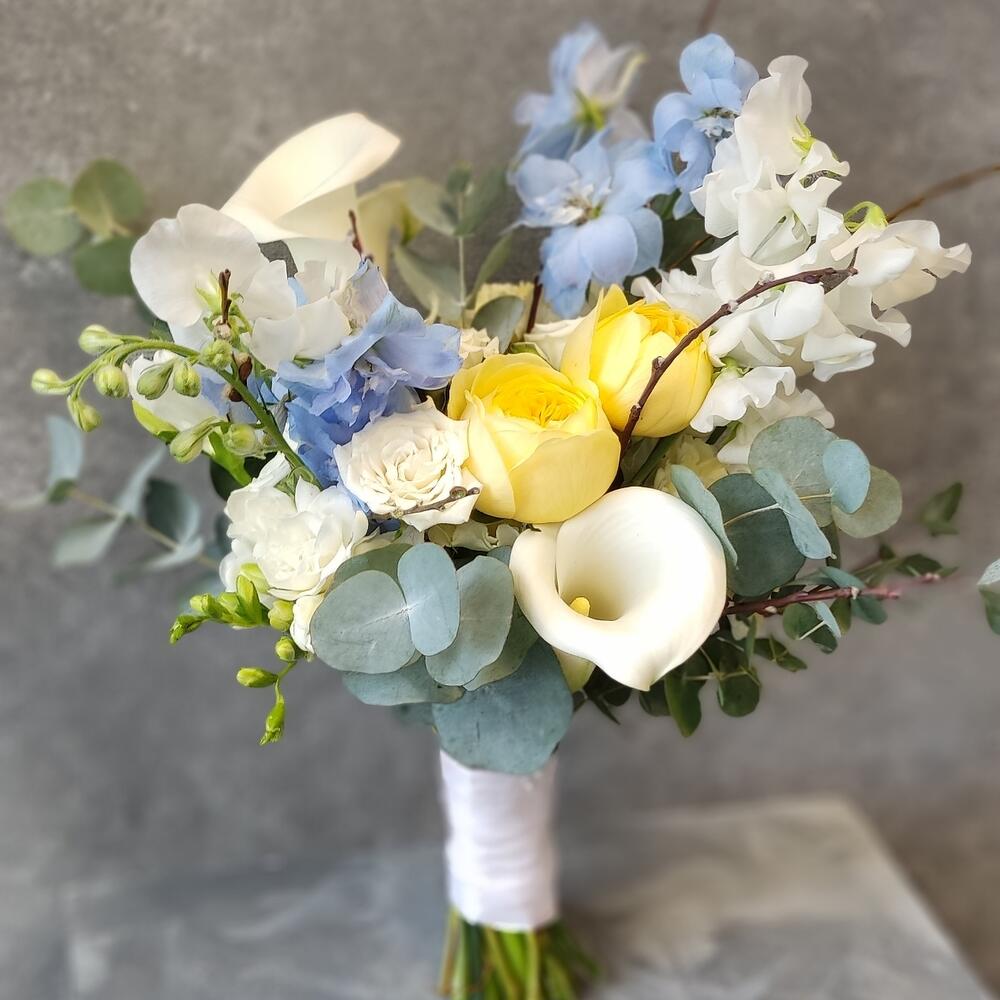 Дельфиниум – 2 шт.Калла – 3 шт.Латирус – 3 шт.Роза кустовая – 3 шт.Эвкалипт – 3 шт.Диантус – 5 шт.Роза садовая – 2 шт.лента декоративная – 1 шт.ветки декоративные – 3 шт.бутоньерка для жениха – 1 шт.