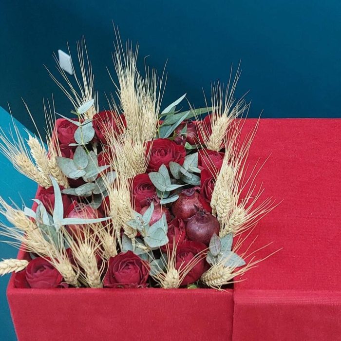 Роза кустовая пионовидная – 4 шт. Эвкалипт – 4 шт. пшиница – 10 шт. гранат мини – 7 шт. торт прага – 1 шт.
