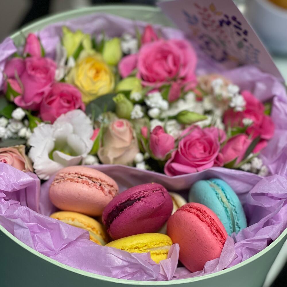 Коробка шляпная с цветами и сладостями.