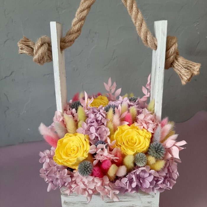 Роза одноголовая – 3 шт.Гортензия – 2 шт.пушистики – 1 шт.Деревянный ящик – 1 шт.