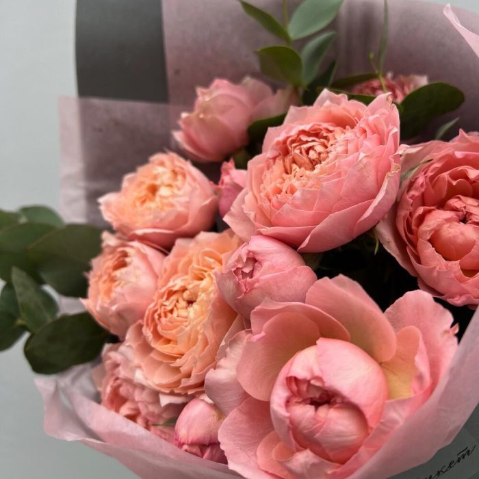 Лента – 1 шт.Тишью – 1 шт.Эвкалипт цинерея – 1 шт.Фоамиран (упаковка) – 1 шт.Роза кустовая джульетта – 3 шт.