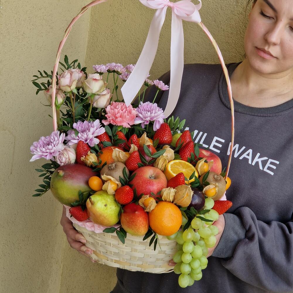 Корзина , в которой прекрасно сочетаются фрукты , ягоды и цветочная композиция.