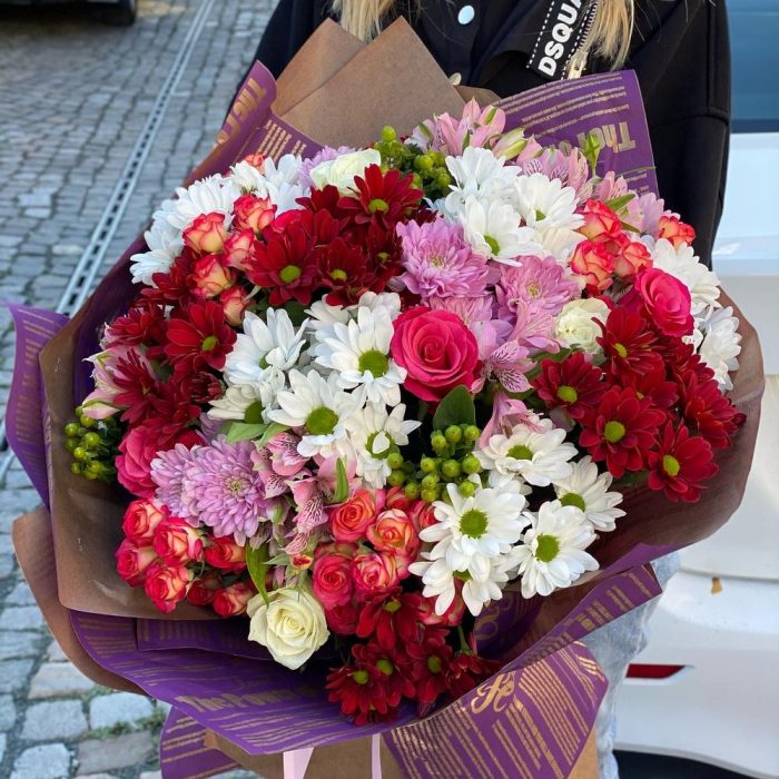 Гиперикум – 3 шт. Роза розовая – 5 шт. Роза белая – 5 шт. Роза кустовая розовая – 5 шт. Альстромерия розовая – 5 шт. Хризантема красная – 5 шт. Хризантема розовая – 5 шт. Упаковка дизайнерская – 1 шт. Хризантема белая – 5 шт.