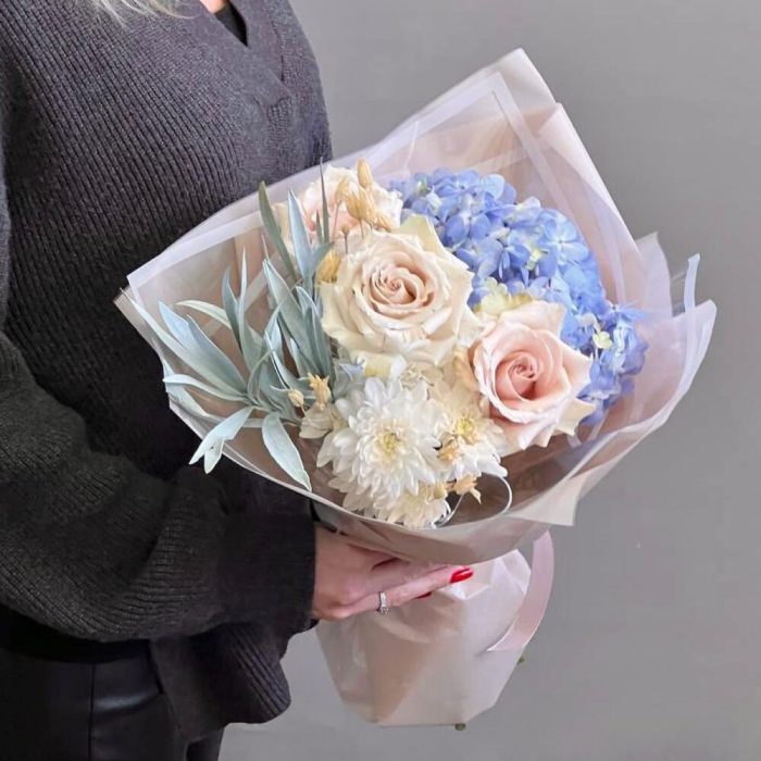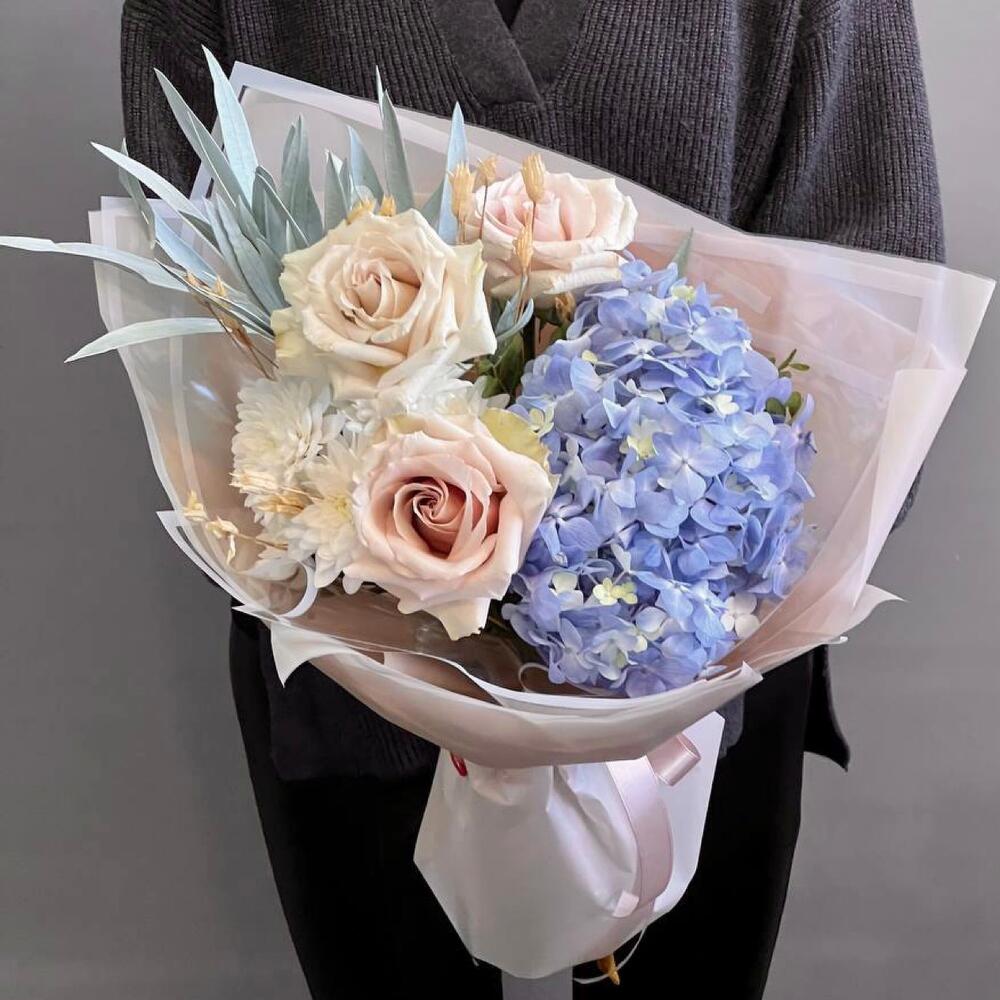 “Эвкалиптическая роскошь” гортензия и пионовидная кустовая роза
