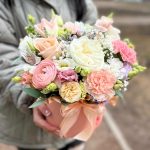 Роза пионовидная одноголовая – 1 шт.Роза пионовидная кустовая – 1 шт.Вероника – 1 шт.Диантус – 1 шт.Эустома – 1 шт.Гипсофила – 1 шт.Роза одноголовая – 1 шт.Альстромерия – 1 шт.Ранункулюс – 1 шт.зелень эвкалипта – 1 шт.