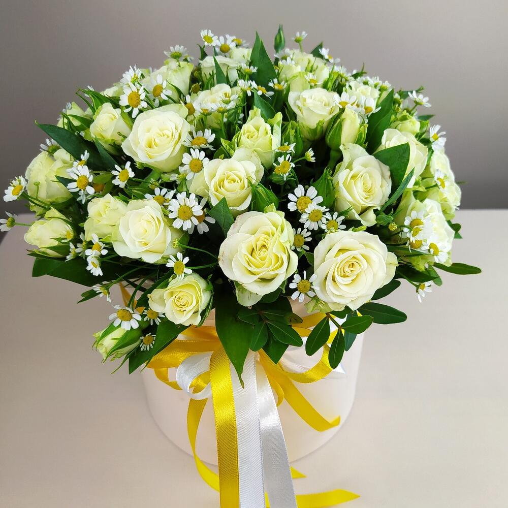 Роза кустовая – 10 шт.Зелень – 3 шт.Лента атласная – 3 шт.Коробка шляпная – 1 шт.Матрикария – 3 шт.