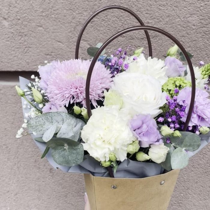 Роза пионовидная – 1 шт.Орнитогалум – 1 шт.Диантус – 4 шт.Эустома – 1 шт.Хризантема – 1 шт.Гипсофила – 1 шт.Эвкалипт – 1 шт.Фисташка – 1 шт.Оазис флористический – 1 шт.Упаковка – 1 шт.Сумка крафт – 1 шт.