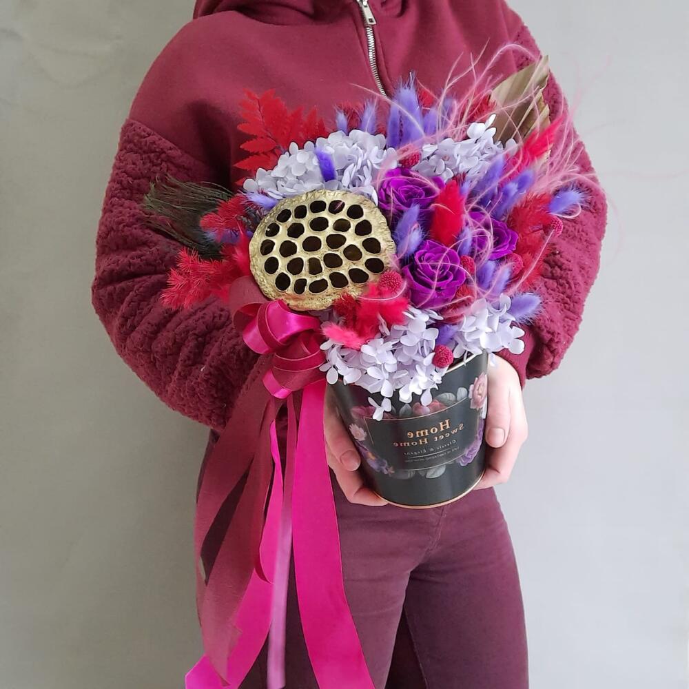 Роза стабилизированная – 3 шт.лагурус пучок – 2 шт.гортензия стабилизированная – 1 шт.ковыль пучок – 1 шт.краспедия стабилизированная – 6 шт.аспарагус стабилизированный – 2 шт.комыш декоративный – 3 шт.пальма сухоцвет – 1 шт.папоротник стабилизированный – 1 шт.перо павлина декоративное – 1 шт.Лотос (коробочка) – 1 шт.Оазис флористический – 1 шт.Лента атласная – 2 шт.Кашпо металлическое – 1 шт.