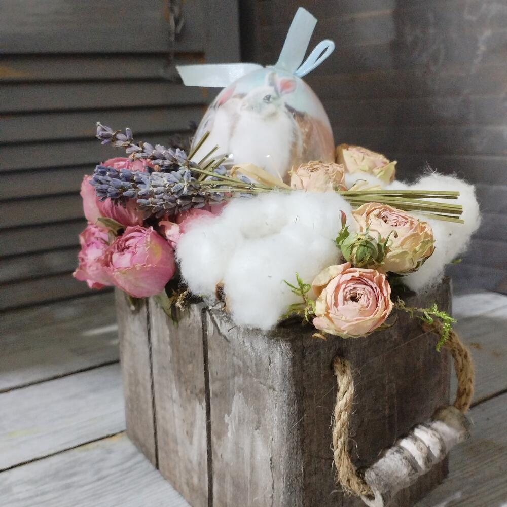 роза засушеная – 15 шт.букетики лаванды натуральной – 4 шт.коробочки хлопка – 2 шт.кашпо деревянное с ручками – 1 шт.яйцо из пластика – 1 шт.бантик атласный – 1 шт.
