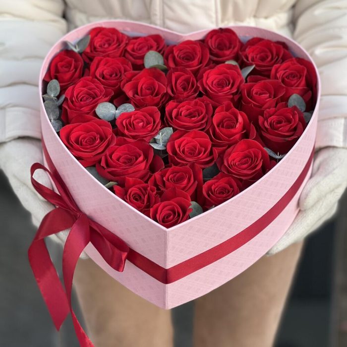 “Сладкое сердце ” – цветочная композиция с сладостями в коробке “Сердце”