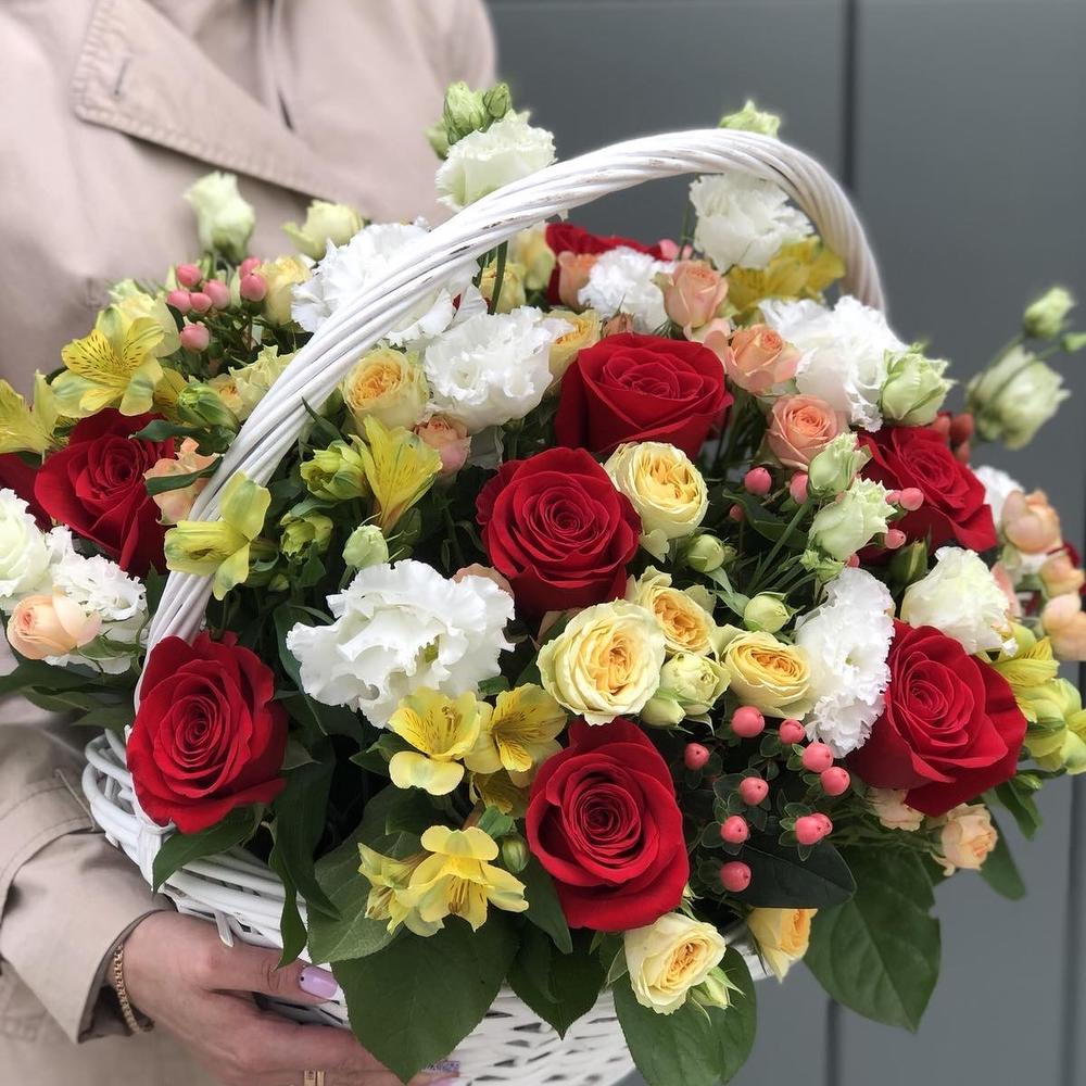 Эустома – 5 шт. Салал – 6 шт. роза красная фридом – 15 шт. Оазис – 3 шт. кустовая роза бандолеро – 5 шт. кустовая роза азора – 8 шт. Гиперикум – 5 шт. Альстромерия – 6 шт. Корзина – 1 шт. Оформление – 1 шт.